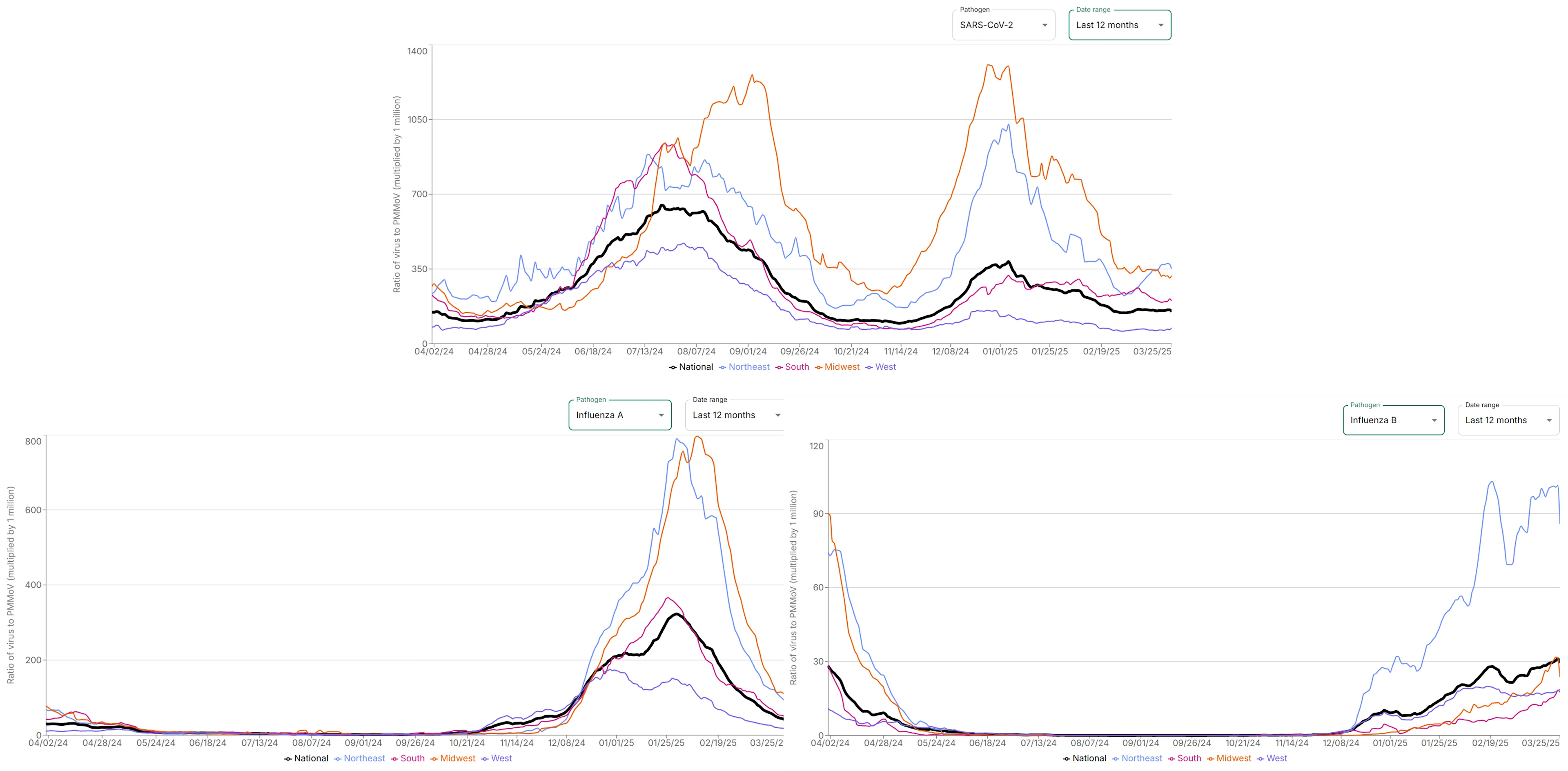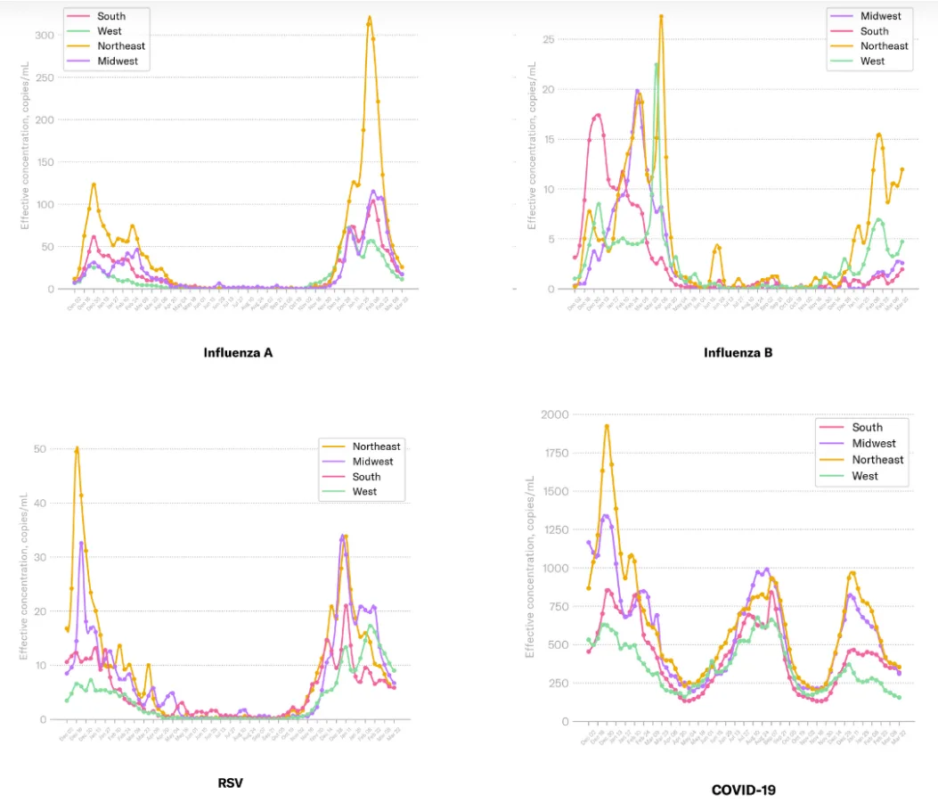 This page shows line graphs that track levels of COVID, flu, and RSV in wastewater over time. Each graph shows results for the four regions of the US: The South, the Northeast, the Upper Midwest, and the West.