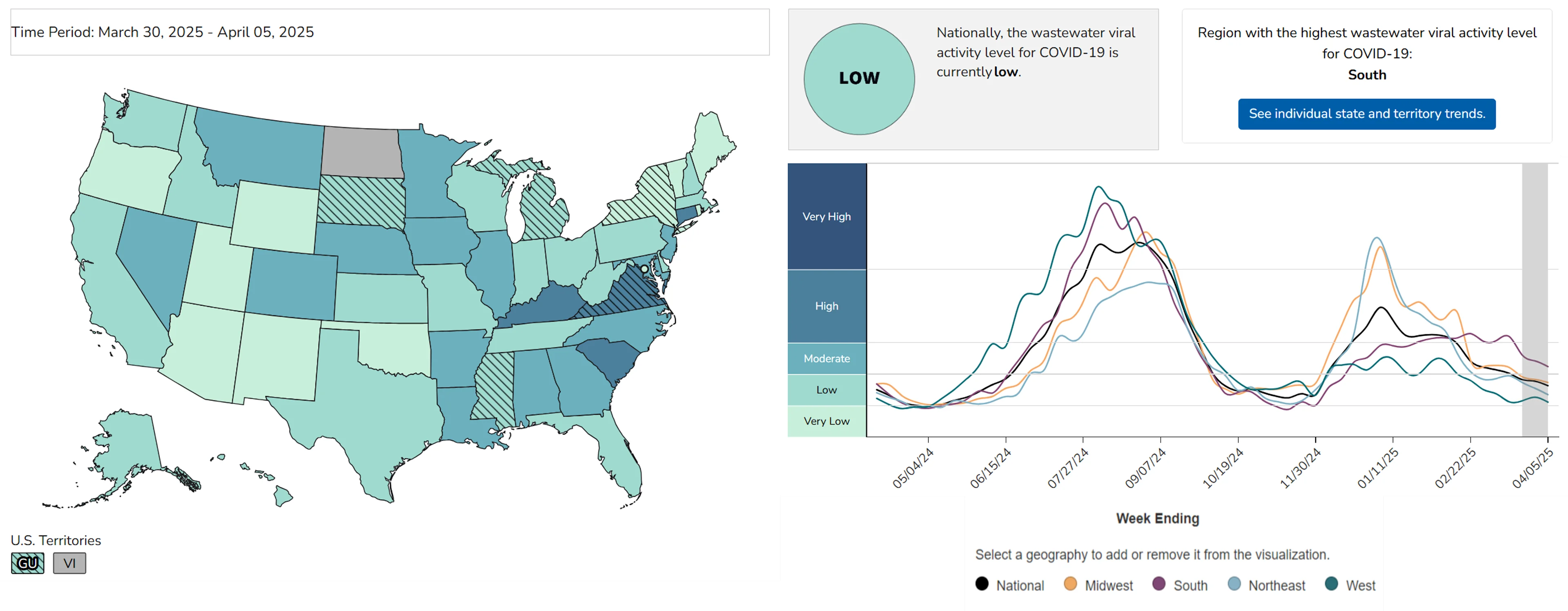 This page shows CDC data on COVID-19 in wastewater with a five- to 12-day delay. For example, when the map is updated on April 14, it shows the data for the week ending April 9.